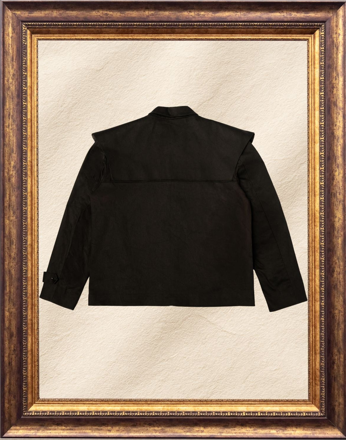 Crafted from a high-quality, matte-finish black cotton, the jacket is designed with a full-length front zipper and a crisp pointed collar for a refined aesthetic.