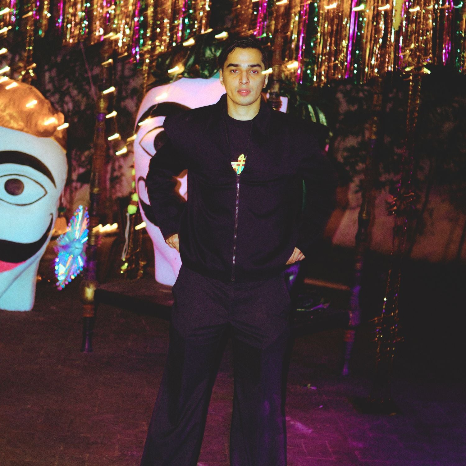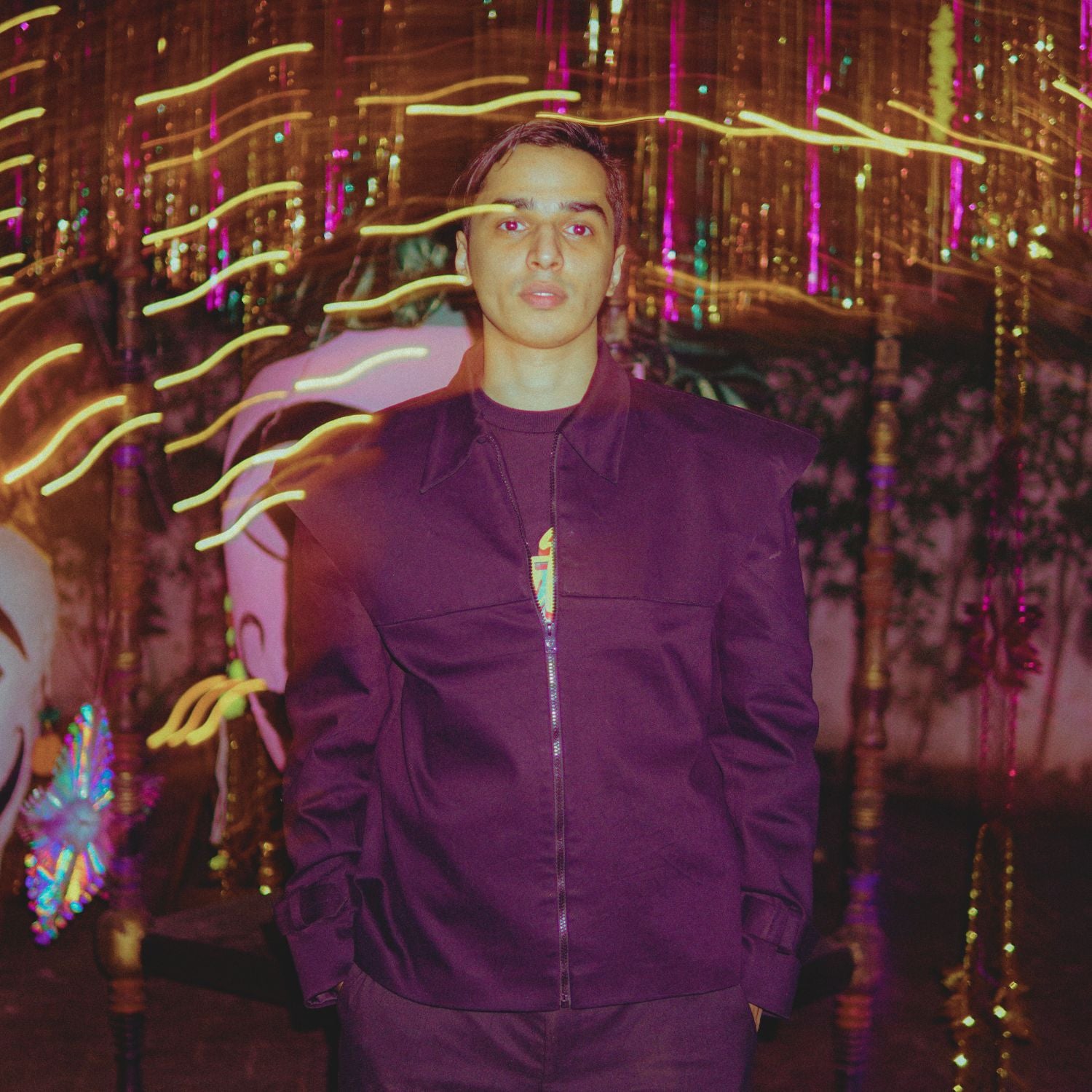 This avant-garde piece features a distinctive exaggerated shoulder overlay that creates a sharp, cosmic-inspired profile.