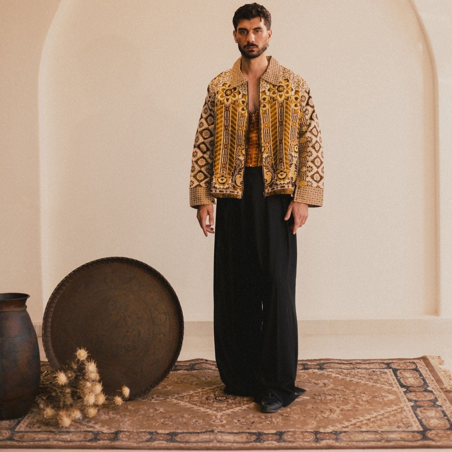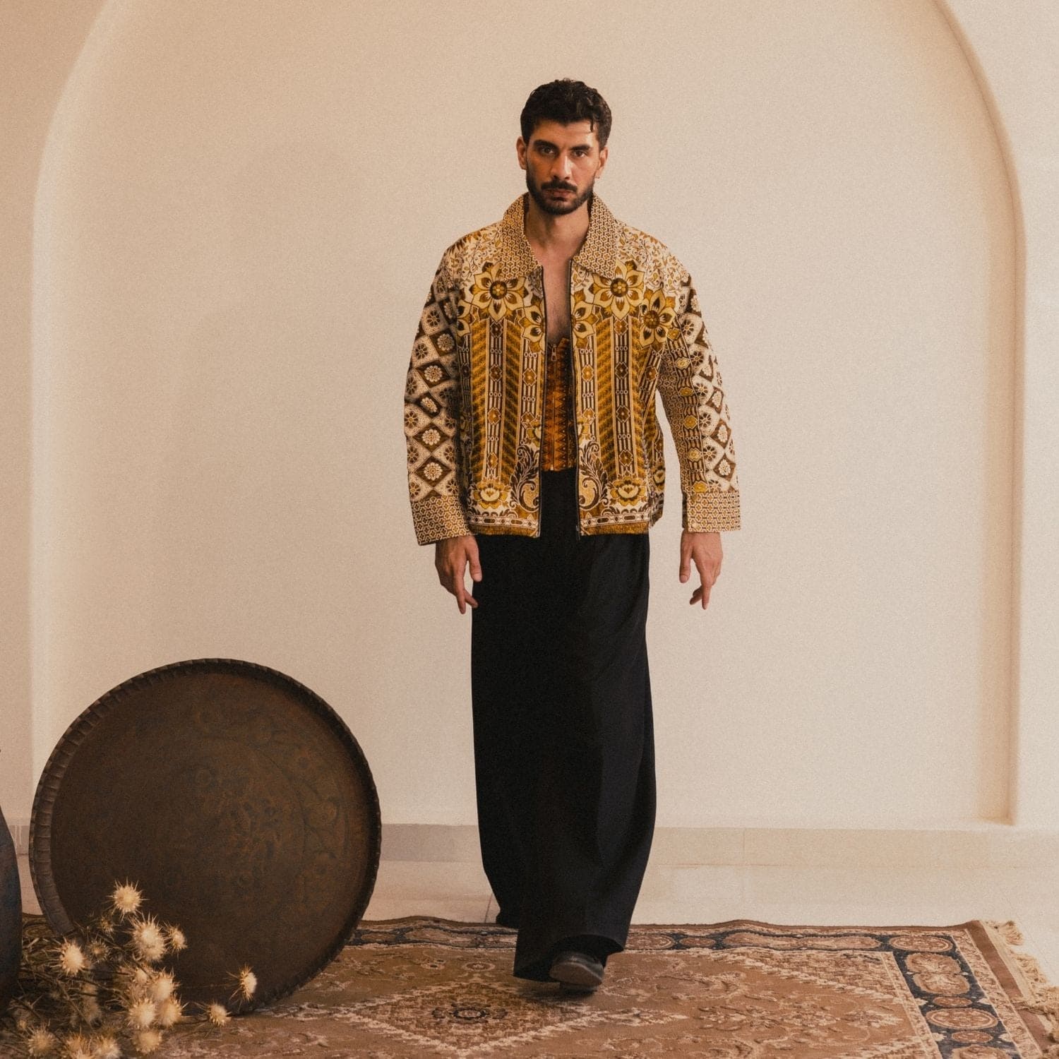 The Dune Cropped Jacket captures the raw shimmer of survival. This cropped jacket is tailored from a unique jacquard weave of cotton and cotton-poly threads, creating a natural sheen that shifts between gold, rust, and deep brown — evoking windblown sand, dry earth, and traces of heat.