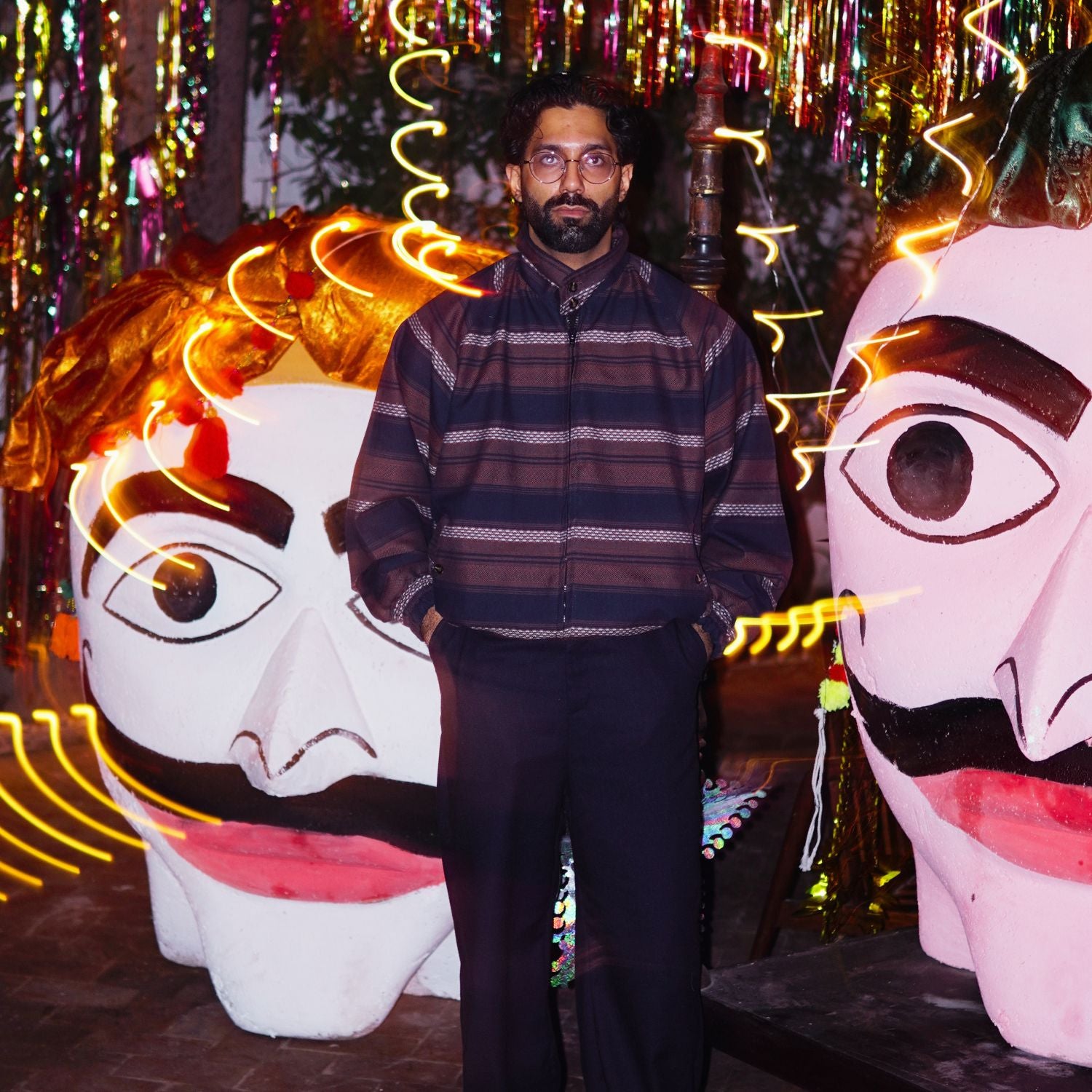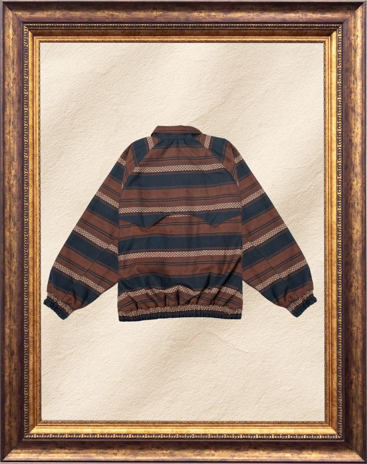 Crafted from striped cotton in rust, navy blue, and brown, this jacket is shaped with raglan sleeves and a relaxed blouson fit. A foldable collar allows the silhouette to shift: worn down for a classic look or turned up into a stand collar for a more structured expression.