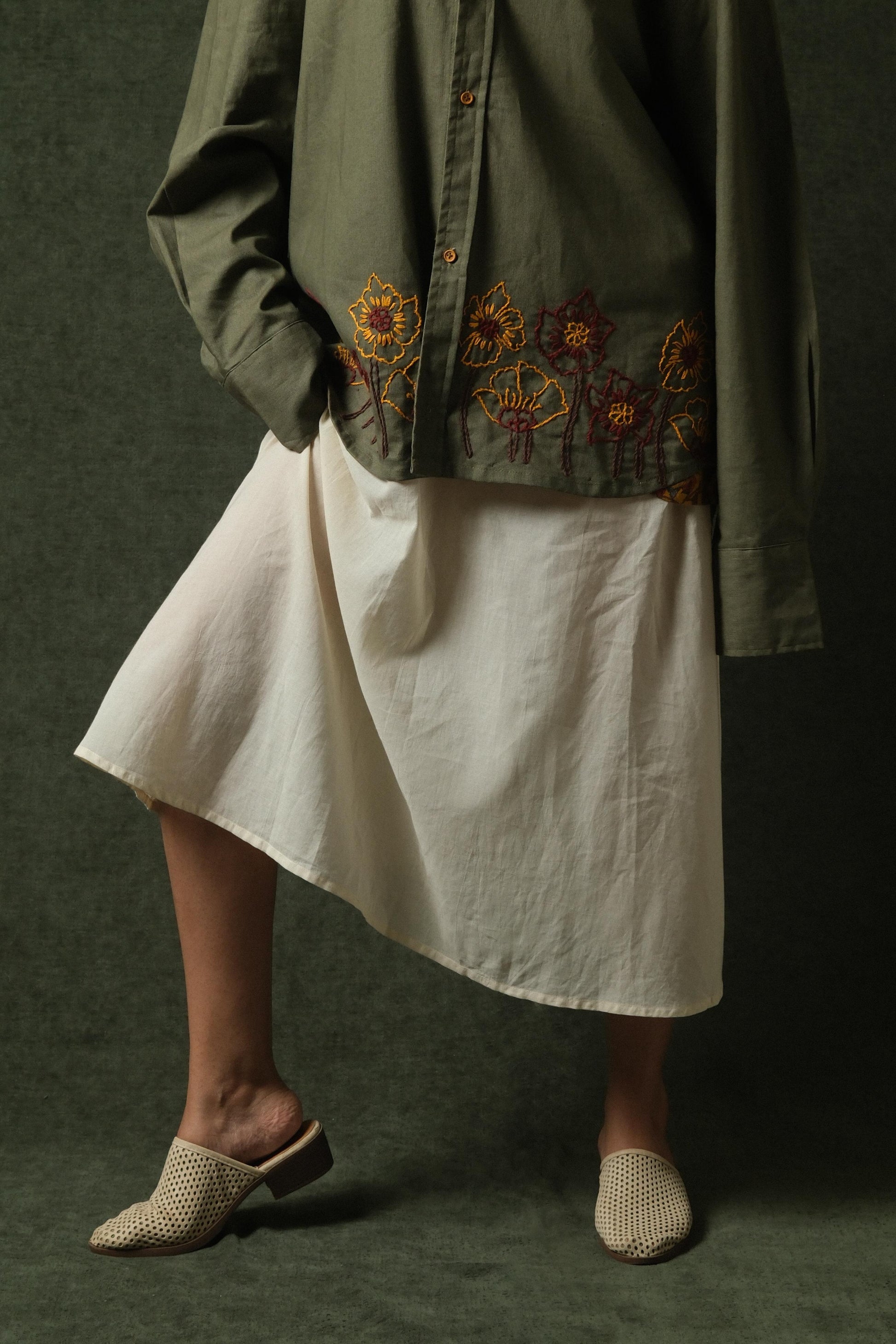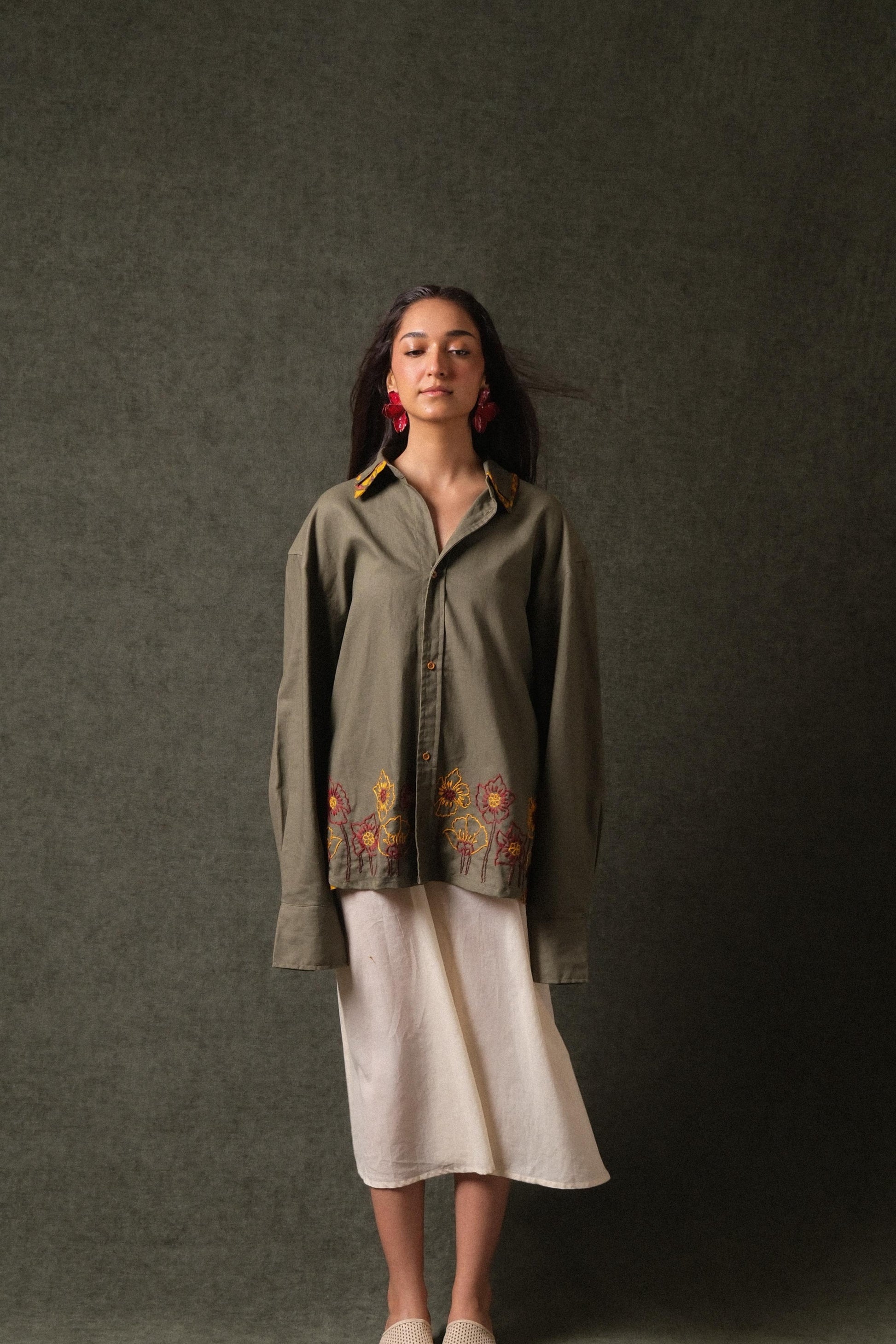 The Rajput Shirt from Collected XX is an exaggerated, oversized full sleeve button down, crafted from breathable Olive coloured Irish Cotton.