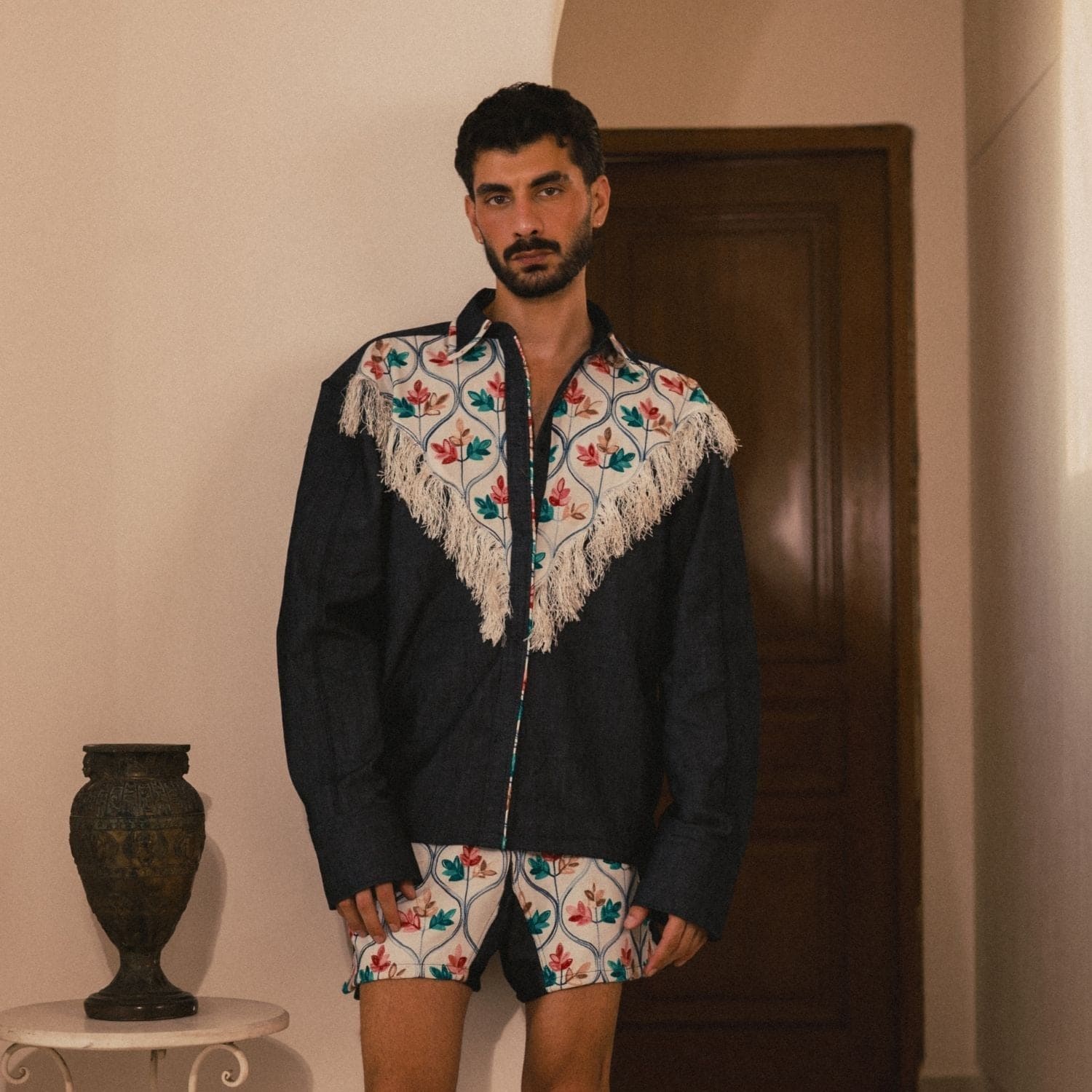 Spineflower Shorts are cut in a low-length boxer silhouette, designed for effortless movement and sun-worn ease. Made from soft denim, and feature hand embroidered panel on the front.