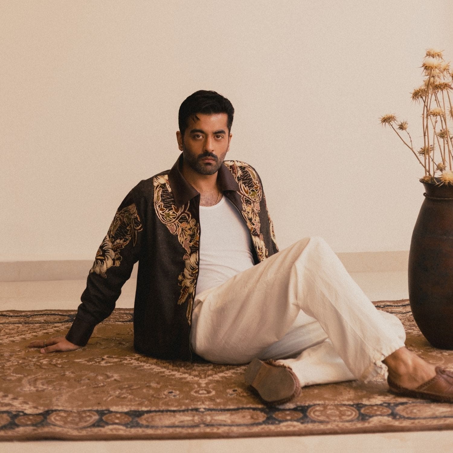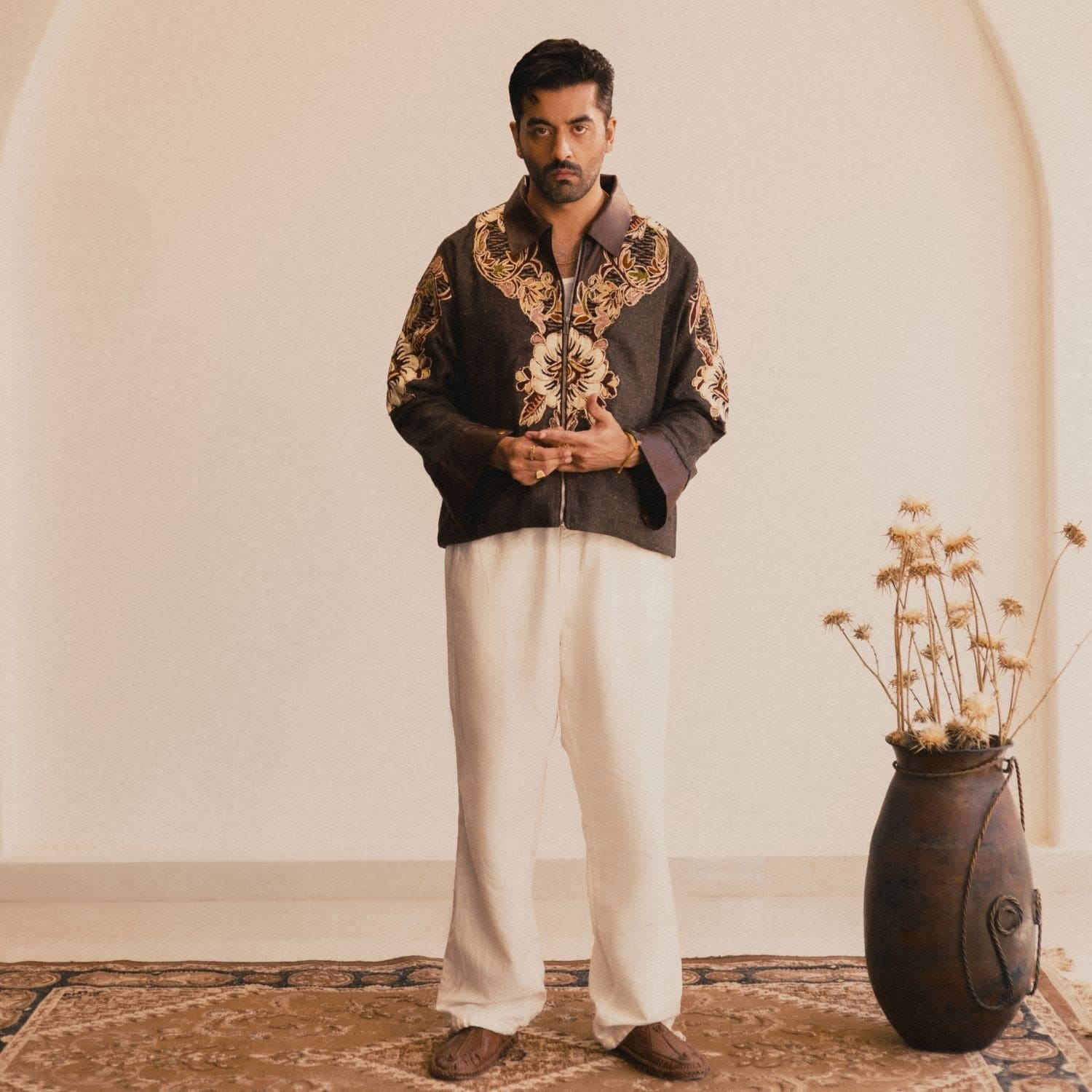 The Thornlace Cropped Jacket is a tactile ode to resilience — where delicacy meets defense. Crafted from earth-toned brown cotton, this structured silhouette is softened by an intricate jacquard appliqué of floral vines that entwine across the neckline and sleeves, like wild blooms growing stubbornly from dry ground.